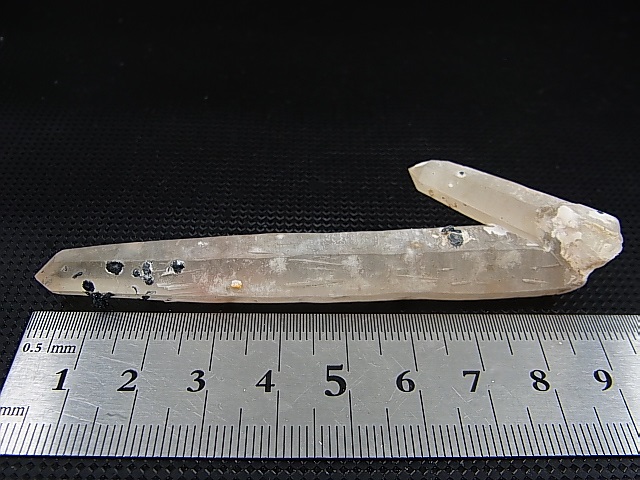 本品はレーザー型の水晶で内モンゴル産によく見られるヘマタイト(アイアンローズ)が付着しています。