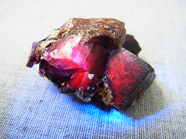長波紫外線で鮮やかな赤色に蛍光する、コレクターに人気のオハエラ鉱山産フローライトです。