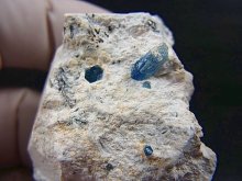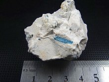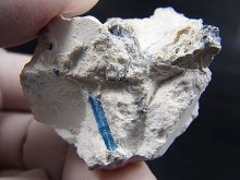 本品は産状が粘土鉱物のカオリナイトに埋まったアクアマリン柱状結晶です。