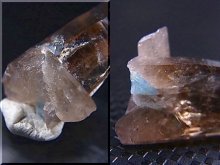 形が良く透明な小さなスモーキー水晶の下部にブルーのアクアマリンが貫入して共生しています。