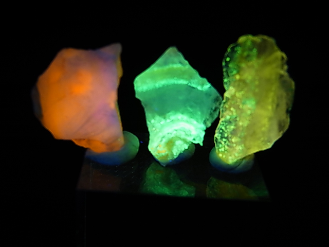 内包する金属元素によりオレンジ・グリーンなど様々な色に蛍光します。