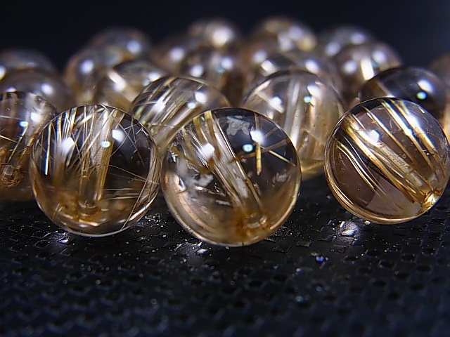 ルチルの中でも針状の結晶が密集し束になっているタイチンルチルの入った水晶ビーズです。