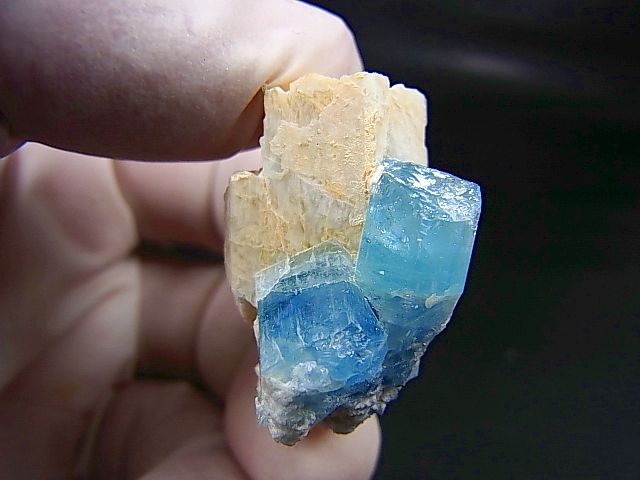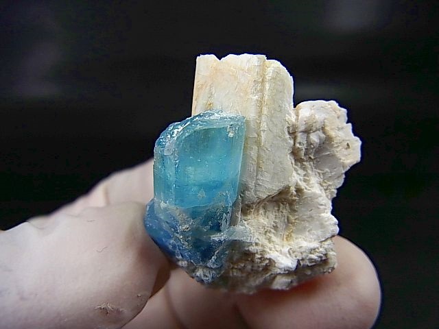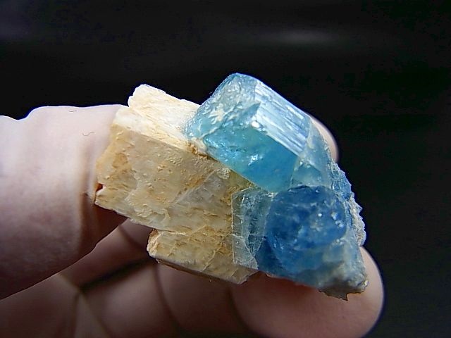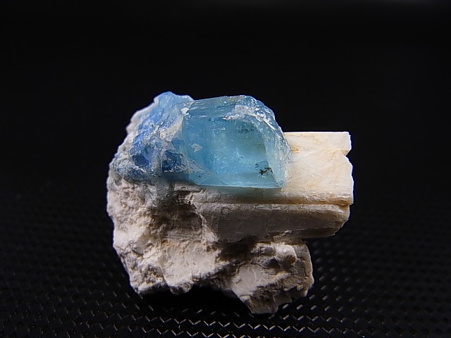 本品は美しい透明感のあるブルーの太い柱状結晶のアクアマリンと微斜長石(マイクロクリン)が共生しています。