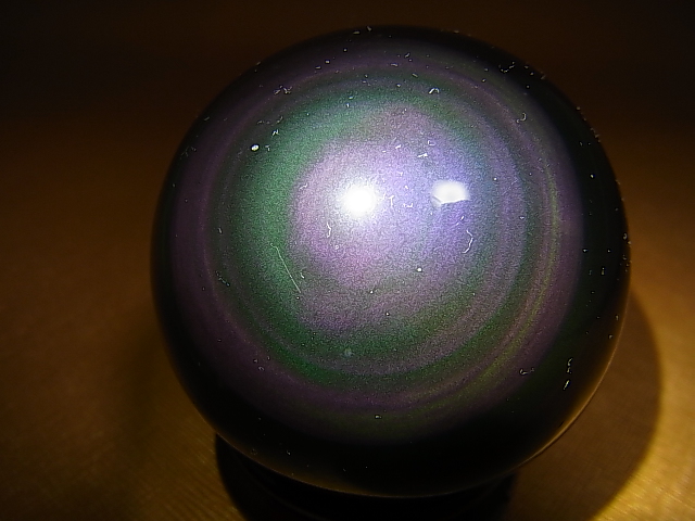 強い光や太陽光を当てると表面に緑やピンク・青などが浮かび上がるレインボーオブシディアンです。