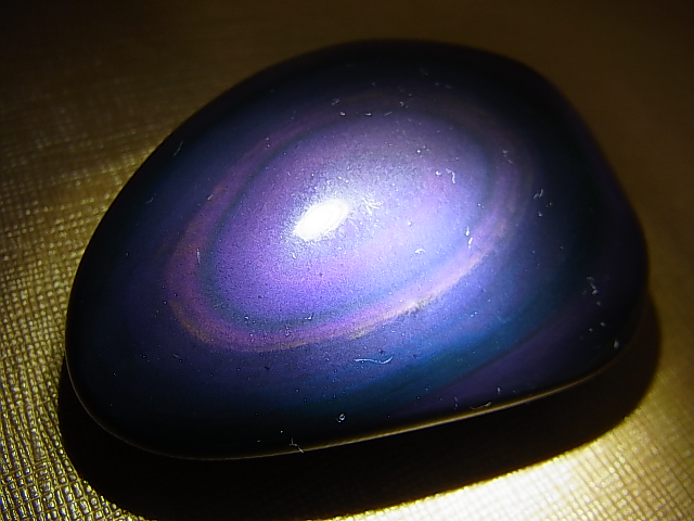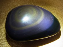 強い光や太陽光を当てると表面に緑やピンク・青などが浮かび上がるレインボーオブシディアンです。