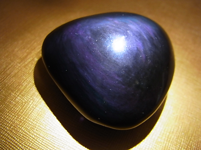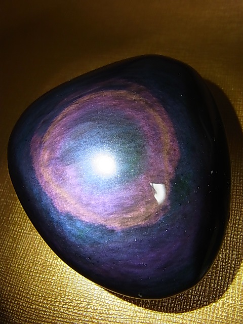 強い光や太陽光を当てると表面に緑やピンク・青などが浮かび上がるレインボーオブシディアンです。