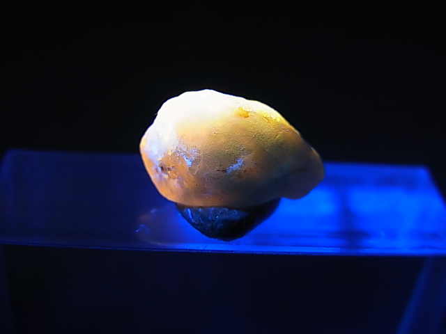 長波紫外線を当てるとオレンジ色に蛍光します。
