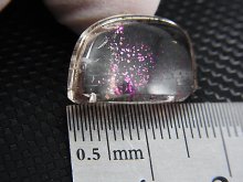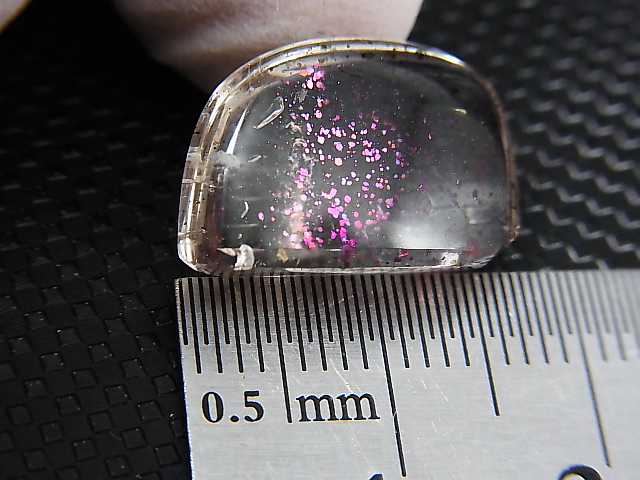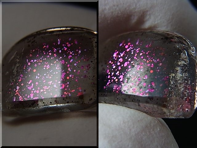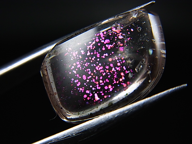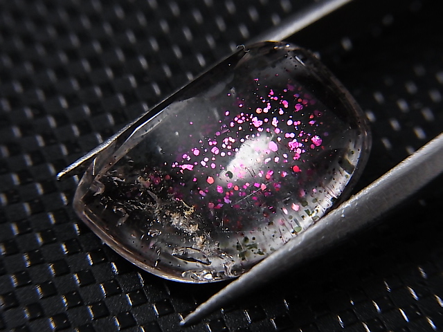 水晶(主にエレスチャル)に内包された鉱物が光が当たる角度で鮮やかなピンク色の粒になってキラキラと浮き上がります。
