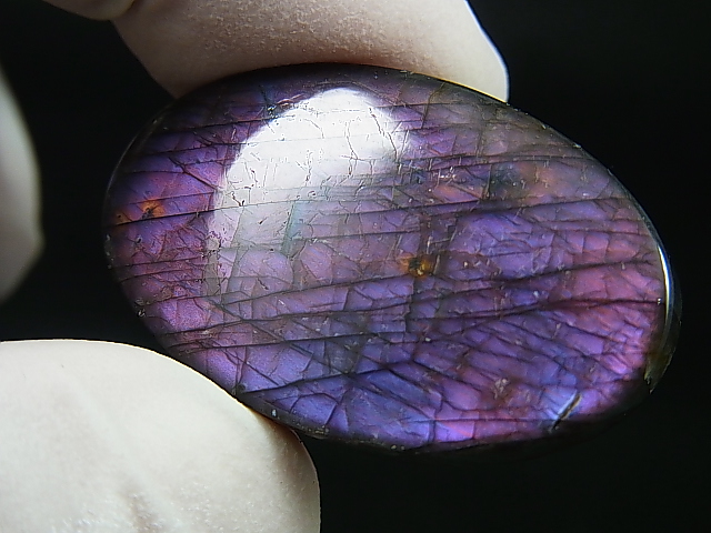 珍しいパープルやピンク色のシラー(ラブラドライトレッセンス)が見えるラブラドライト研磨原石です。
