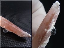 本品はレーザー型の水晶で内モンゴル産によく見られるヘマタイト(アイアンローズ)が付着しています。