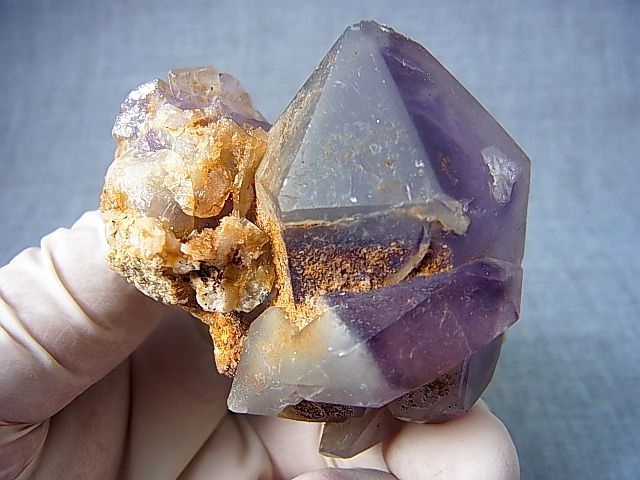 本品の二つの連晶はそれぞれトップが再結晶の形状になっていて紫のファントムが見えます。