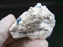 本品は産状が粘土鉱物のカオリナイトに埋まったアクアマリン柱状結晶です。
