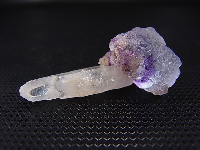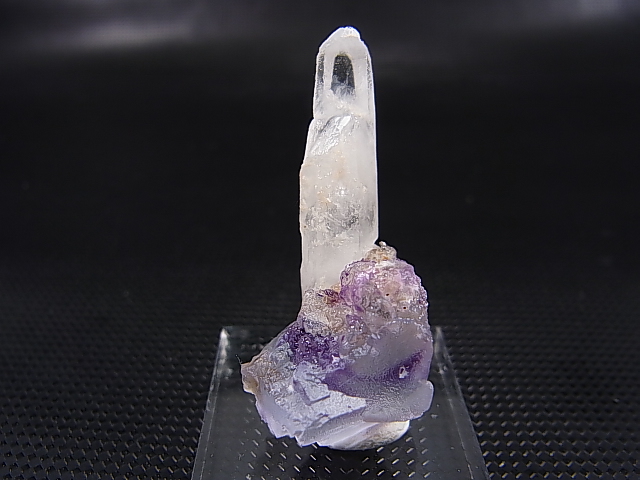 カラーレスと内部に点在するパープルカラーのフローライトが水晶と共生したレアなサンプルです。