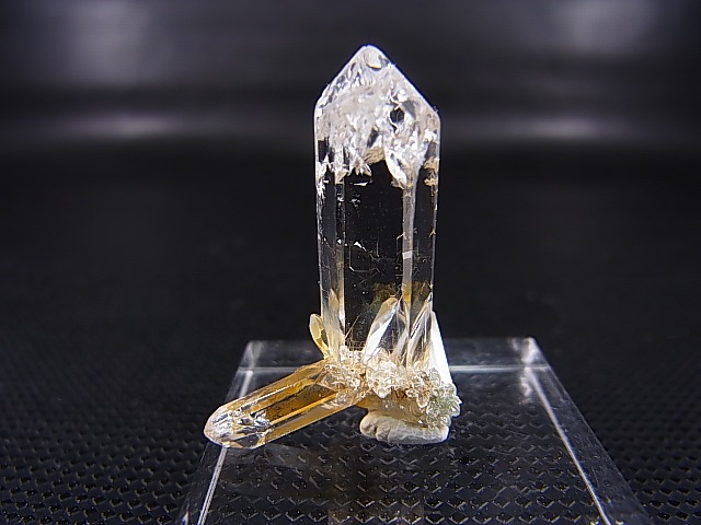 透明な水晶の中にゴールドルチル(酸化チタン)の針状結晶が見えるレアなサンプルです。