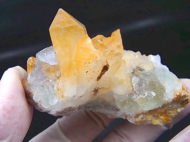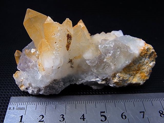 リモナイト(褐鉄鉱)の皮膜によるゴールデンヒーラー水晶クラスターと共生した珍しいサンプルです。