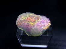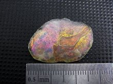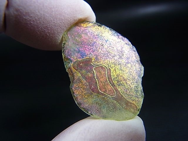 小さな古代ガラス片ですが、まるでアンモライトのジュエリーのような美しい虹色で「銀化」をしています。