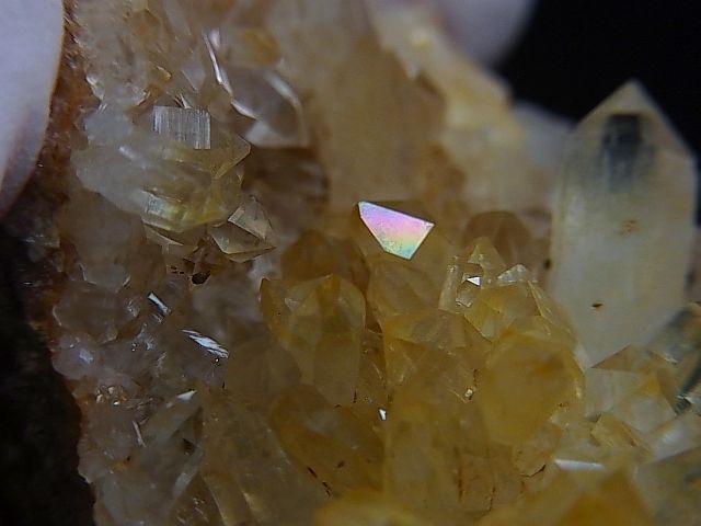 本品は褐鉄鉱によるゴールデンヒーラーで一部水晶の錐面に虹色のオーラ被膜が見られる水晶です。