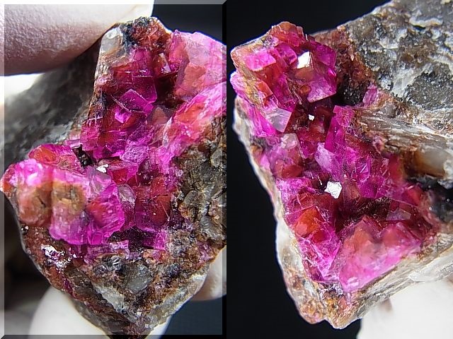結晶は目視でわかる直方体や立方体の群晶で美しいピンク色がキラキラ光ります。