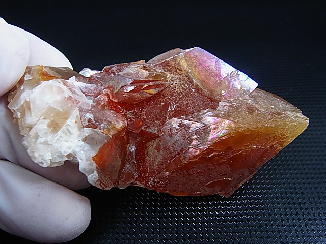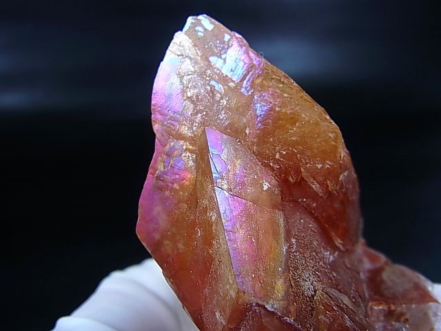 本品は尖った大きな犬牙状と表面被膜にマンガンや酸化鉄が着けたと思われるオーラ被膜が現れている
