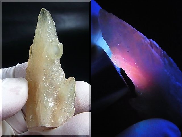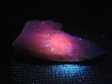 暗所で紫外線ランプを当てると赤く蛍光する珍しいサンプルです。