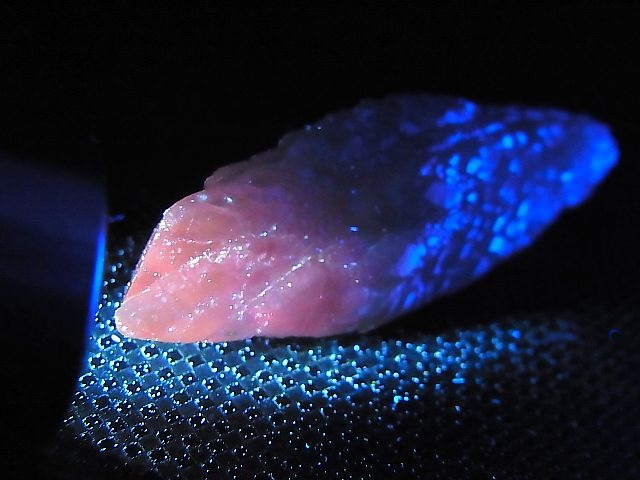 暗所で紫外線ランプを当てると赤く蛍光する珍しいサンプルです。
