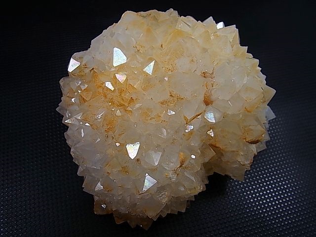本品は褐鉄鉱によるゴールデンヒーラーで一部水晶の錐面に虹色のオーラ被膜が見られる水晶です。