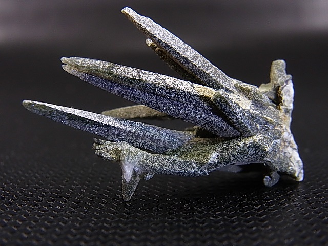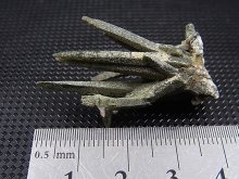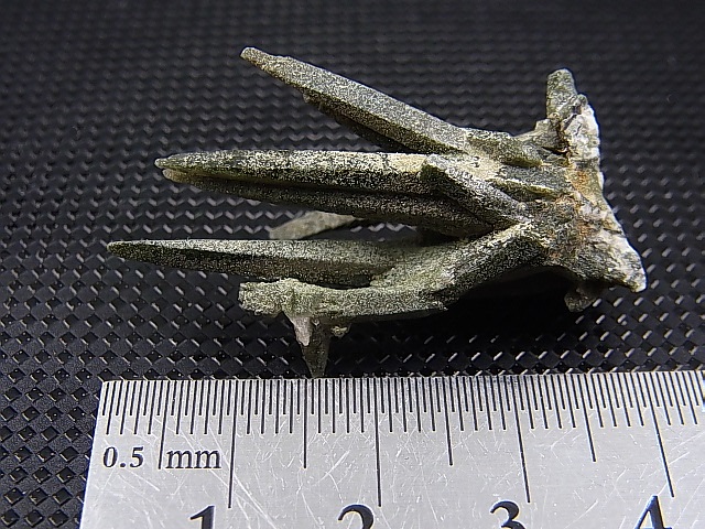 クローライトが内包しリモナイト(褐鉄鉱)の皮膜が特徴で、鋭い針のようなDT水晶の群晶です。
